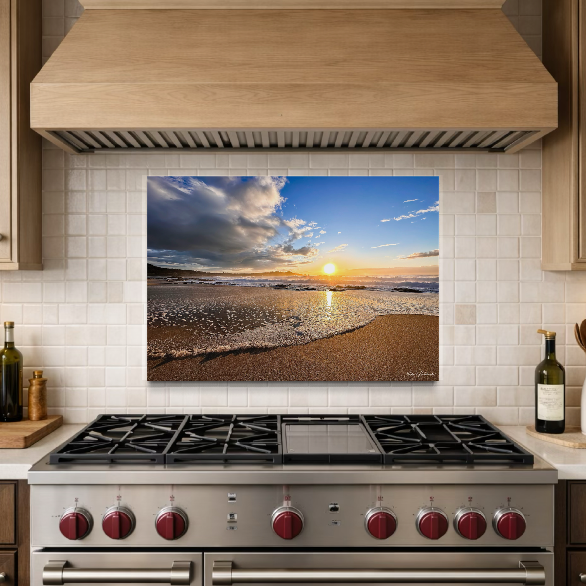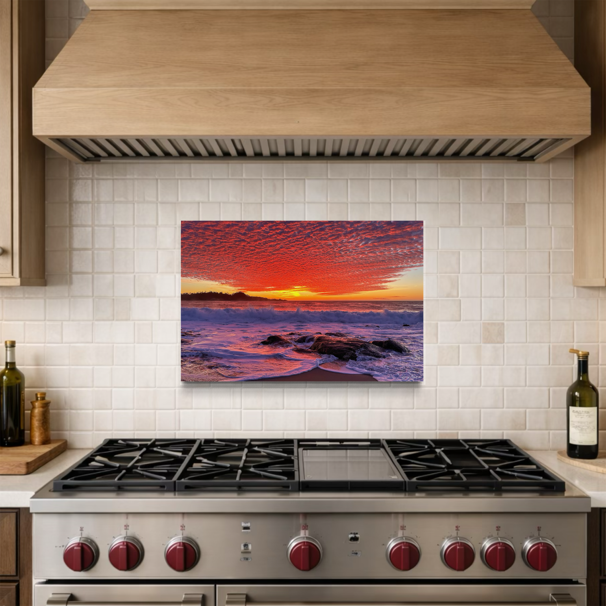 Measure with and height of the backsplash or wall area. Select the size that feels most visually balanced within the space. Allow for a minimum 2" clearance between the mosaic and the hood above the stove.
