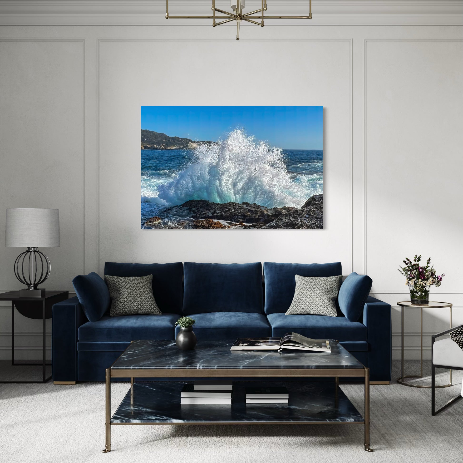 Face-mounted beneath polished acrylic, the image radiates exceptional depth and vibrancy. The glossy surface amplifies every detail—from the translucent blues in the water to the fine mist suspended in the air—transforming this natural moment into a living artwork. HD Metal and Crystal archive fine art paper prints also available.